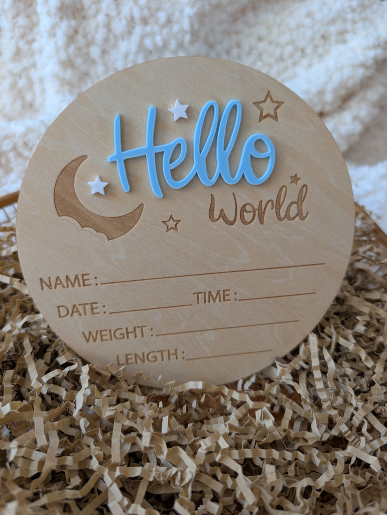 2. “Hello World” Wooden Plaque: Made from laminated wood, this plaque lets you announce your little one’s arrival with charm and elegance.