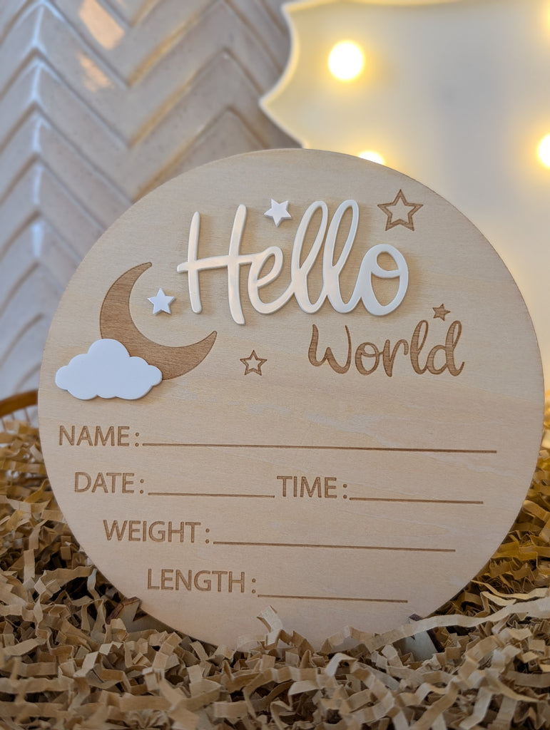 2. “Hello World” Wooden Plaque: Made from laminated wood, this plaque lets you announce your little one’s arrival with charm and elegance. Approximate size: 15 cm